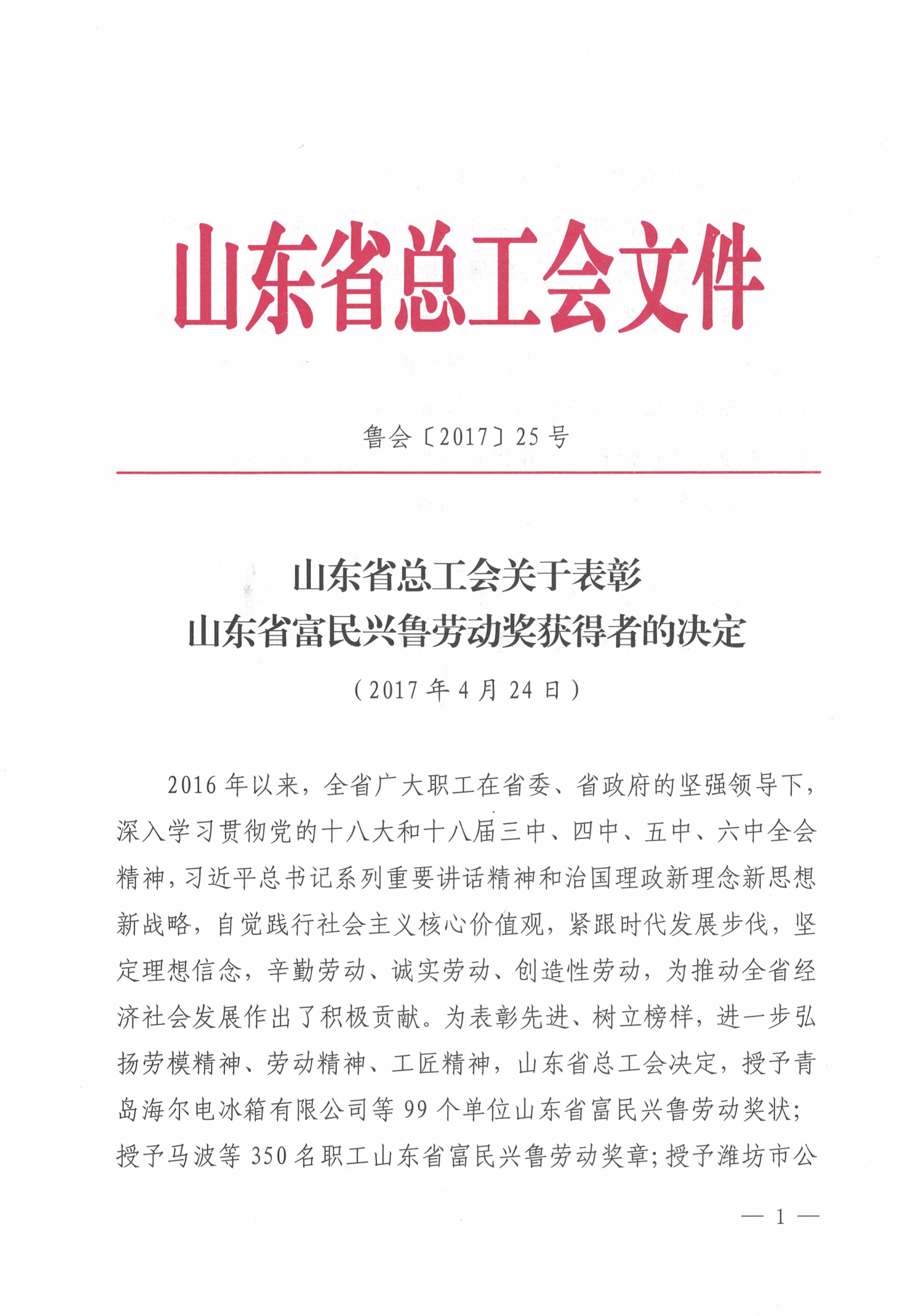 據(jù)了解,“富民興魯勞動獎狀”是山東省總工會組織評選的先進(jìn)集體獎項,旨在激發(fā)各單位自覺踐行社會主義核心價值觀,緊跟時代發(fā)展步伐,堅定理想信念,辛勤勞動、誠實勞動、創(chuàng)造性勞動,為推動全省經(jīng)濟社會發(fā)展作出積極貢獻(xiàn),最終為實現(xiàn)“十三五”規(guī)劃目標(biāo)任務(wù)和全面建成小康社會建功立業(yè)。