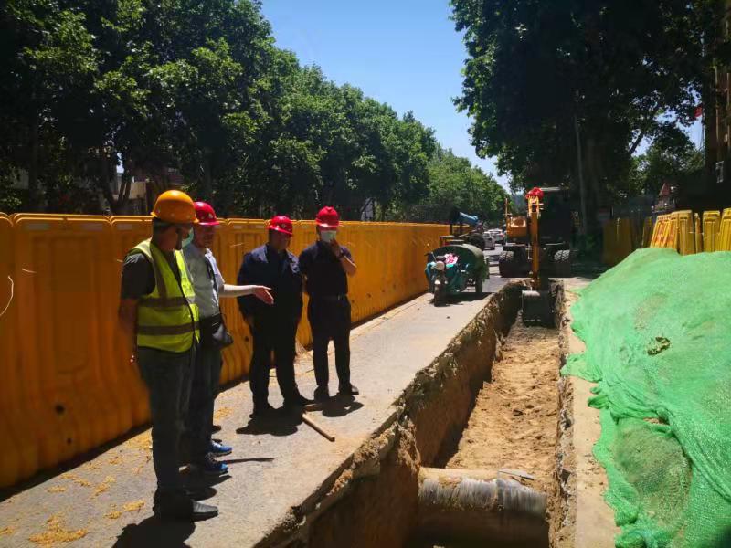 施工前期,為了保障沿途各交叉管線的線路安全,采取了全線高水馬圍擋全封閉式施工,邀請(qǐng)各交叉管線的產(chǎn)權(quán)單位到施工現(xiàn)場(chǎng)溝通協(xié)調(diào),并遵循安全文明施工與環(huán)境保護(hù)的要求,與各施工隊(duì)伍簽訂“2021年‘冬病夏治’計(jì)劃施工安全保證協(xié)議書(shū)”。期間,安排專(zhuān)人對(duì)施工現(xiàn)場(chǎng)的圍擋支護(hù)、溝槽開(kāi)挖、防揚(yáng)塵措施、工具擺放等方面進(jìn)行全方位、全時(shí)段、全覆蓋的巡查,緊抓問(wèn)責(zé)不放松。同時(shí),對(duì)施工現(xiàn)場(chǎng)進(jìn)行組織調(diào)度,使各項(xiàng)改造工作有序銜接、穩(wěn)步推進(jìn)。