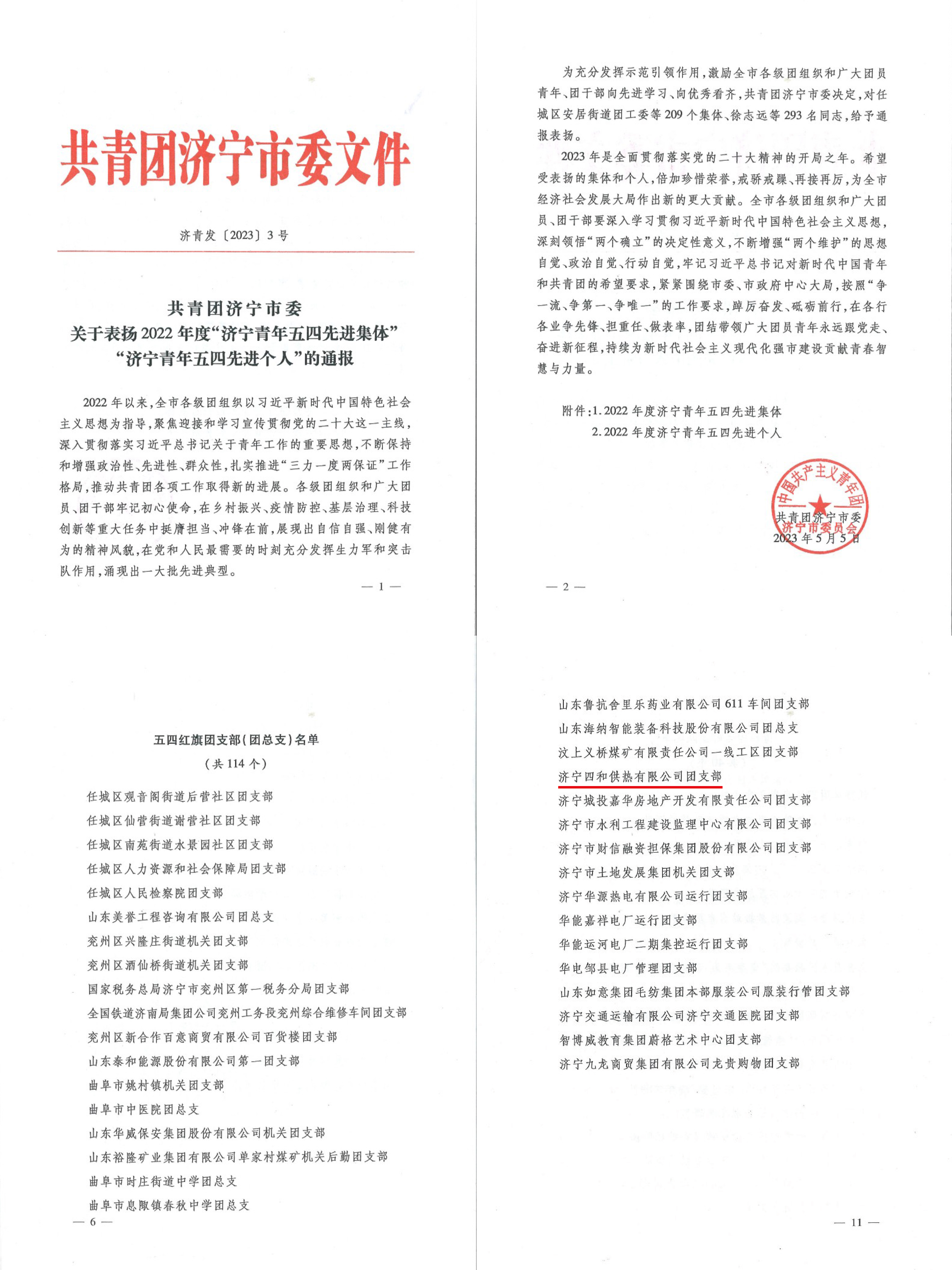 近日,共青團(tuán)濟(jì)寧市委印發(fā)了《關(guān)于表揚2022年度“濟(jì)寧青年五四先進(jìn)集體”“濟(jì)寧青年五四先進(jìn)個人”的通報》,濟(jì)寧四和供熱有限公司團(tuán)支部名列其中,獲評“濟(jì)寧市五四紅旗團(tuán)支部”。