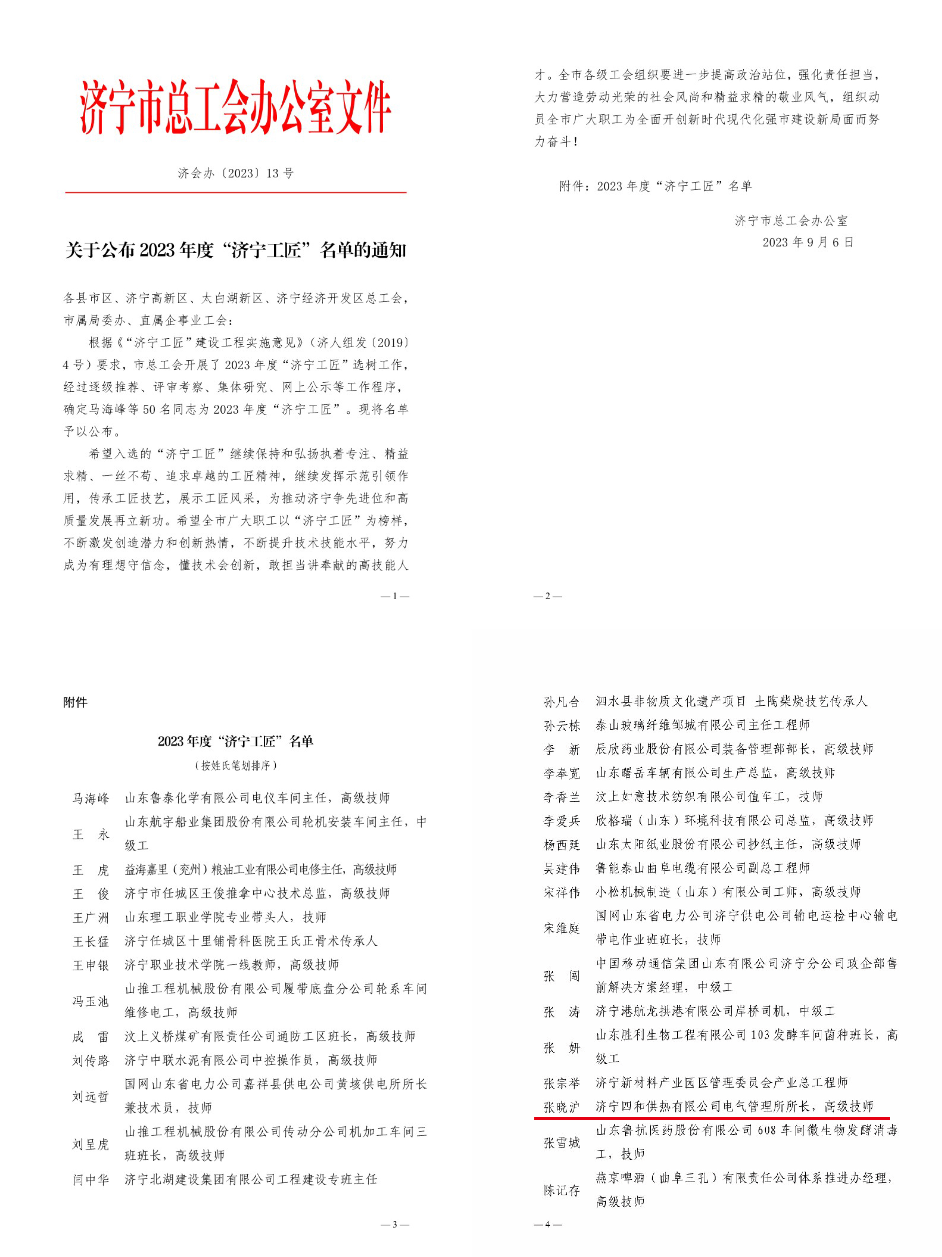 9月6日,濟寧市總工會辦公室印發(fā)了《關(guān)于公布2023年度“濟寧工匠”名單的通知》,濟寧四和供熱有限公司張曉滬同志名列其中,榮獲2023年度“濟寧工匠”榮譽稱號。